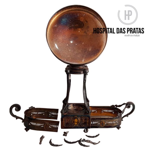 Centro de mesa com estrutura complexa e múltiplos pontos de oxidação, necessitando de reparos. Realizamos a solda total das partes soltas, fizemos o alinhamento e o tratamento individualizado de componentes para uma remontagem precisa. O resultado é uma peça escultural que transforma qualquer ambiente em espaço de requinte contemporâneo.