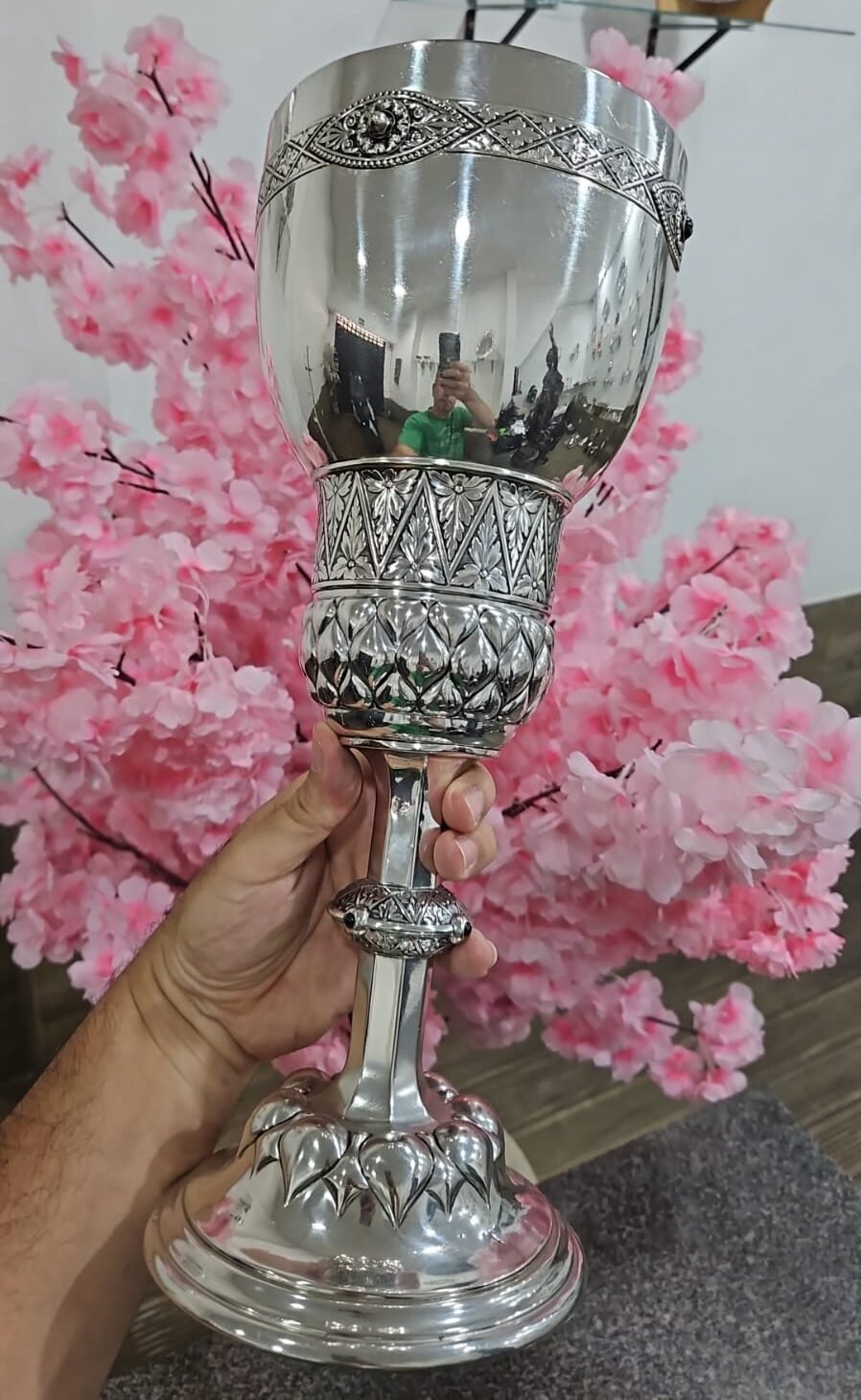 Este magnífico cálice em metal com banho de prata é mais do que um objeto decorativo: é um símbolo de tradição, elegância e bom gosto. Inspirado em modelos clássicos europeus, seu design remete às peças utilizadas em mesas nobres, cerimônias especiais e jantares de prestígio, onde cada detalhe tinha significado.
