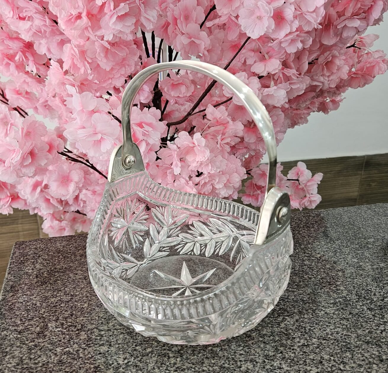 Esta belíssima cestinha em cristal lapidado com alça em metal prateado é uma peça que une delicadeza, funcionalidade e tradição. Inspirada nos modelos clássicos europeus, muito populares entre o final do século XIX e meados do século XX, esse tipo de objeto era presença constante em salas de estar refinadas, mesas de chá e aparadores elegantes.