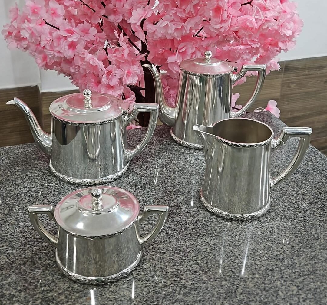 Composto por quatro peças: 01 cafeteira, 01 chaleira, 01 leiteira e 01 açucareiro.