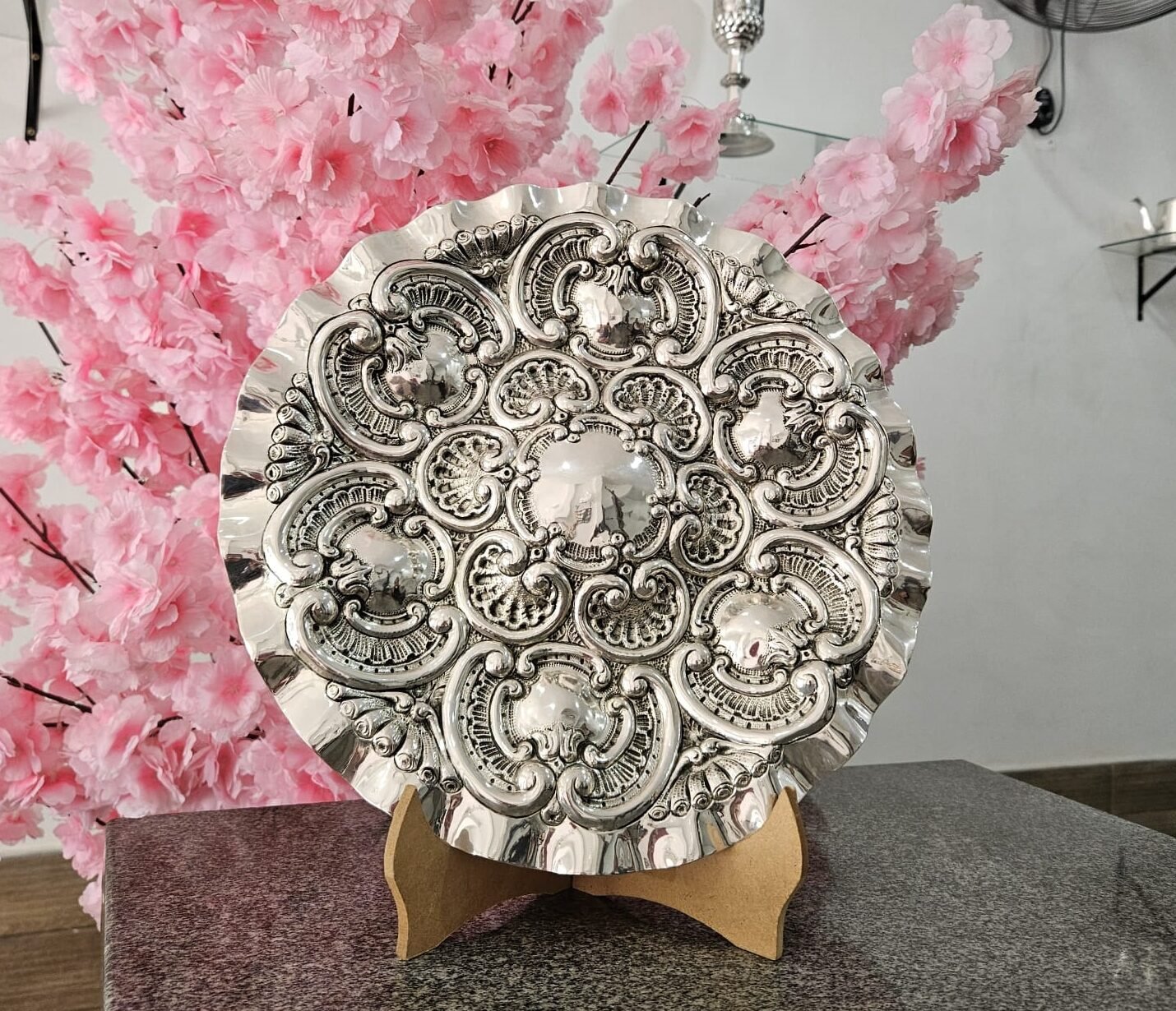 O centro do prato, ligeiramente abaulado, cria profundidade visual e valoriza ainda mais o trabalho artesanal ao redor, enquanto a borda ondulada acrescenta movimento e elegância à composição. O acabamento em prata confere brilho refinado e realça cada detalhe dos relevos, tornando a peça um verdadeiro ponto focal em qualquer ambiente.