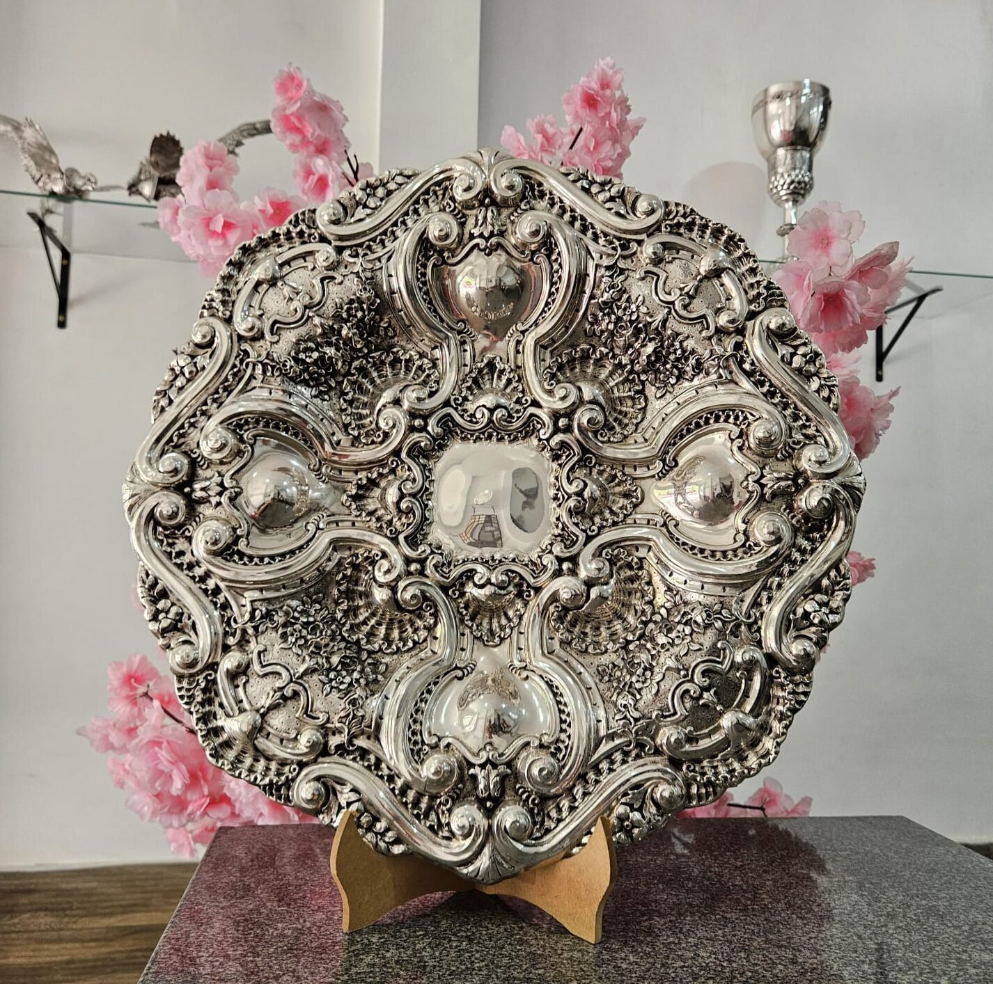 Esse magnífico prato de parede em metal prateado, ricamente ornamentada, é inspirada nos grandes modelos europeus utilizados entre os séculos XVIII e XIX, período em que objetos de mesa deixaram de ser apenas funcionais para se tornarem símbolos de status, poder e refinamento cultural.